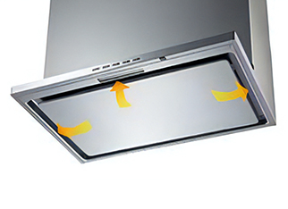整流板により吸い込み速度があがり、油煙を効率よく捕集します。