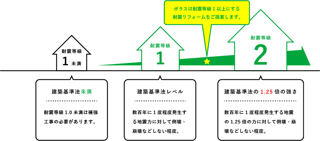 一般診断によって建物の強さや弱点が見えてきます。ポラスグループでは、一般診断の結果から耐震等級1に満たない建物を、耐震等級1以上に補強する工事を計画しご提案します。
